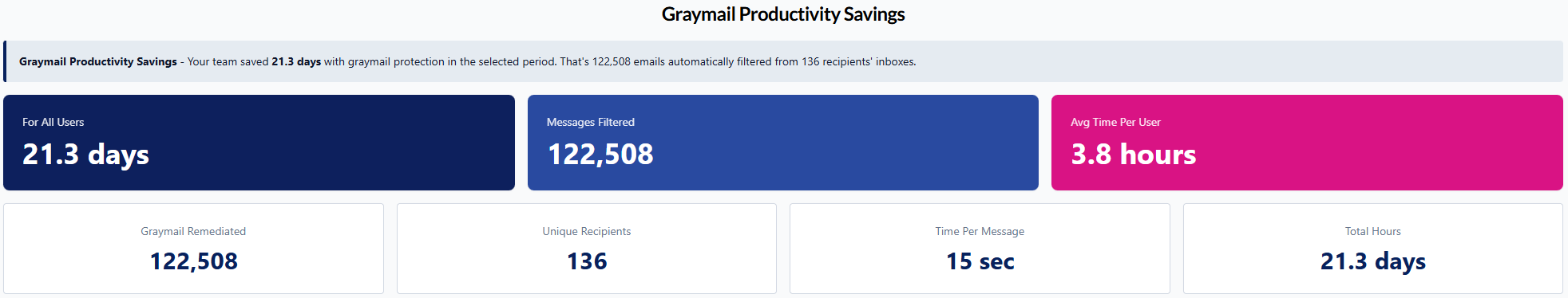 New Productivity Insights: Introducing the Graymail report to measure productivity gains from graymail filtering, revealing time saved at 15 seconds per message.