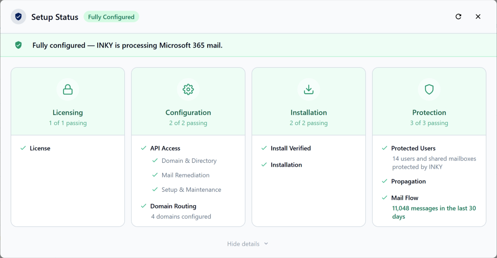 Setup Status — Getting your email routing configured correctly is now much easier. A new Setup Status section on the Settings Summary page walks you through the four phases of email routing setup, showing exactly where you are and what — if anything — still needs attention. Failing steps expand automatically so you can jump straight to what requires action, and the status refreshes on its own so you always have an up-to-date picture without manually reloading the page.