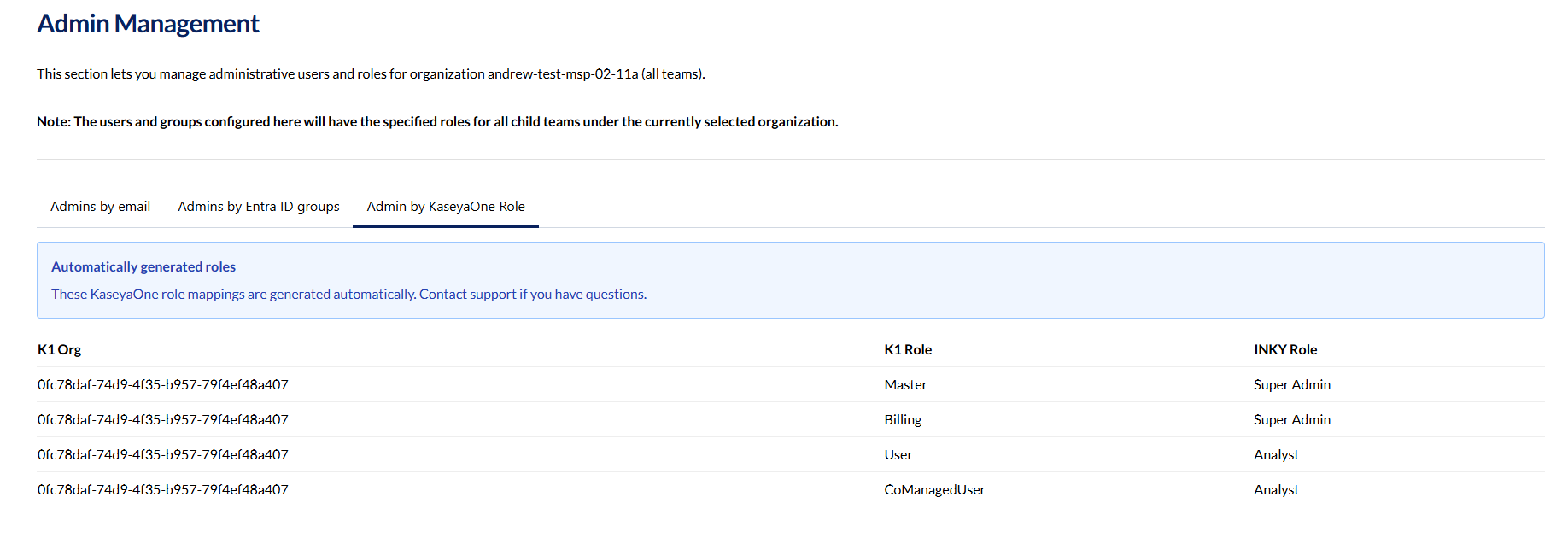 KaseyaOne role-based admin access — A new read-only "Admin by KaseyaOne Role" tab in Settings > Admin Management shows automatic role mappings between KaseyaOne and INKY.